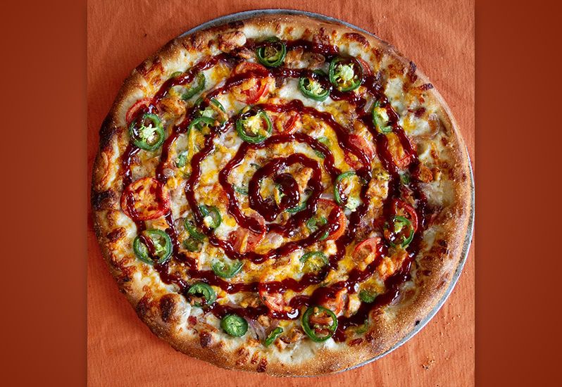 🍕 Pictured is out BBQ 10' - Oil base, mozzarella cheese, bbq chicken,bacon,Roma tomato, onion , jalapeños,cheddar cheese,bbq swirl