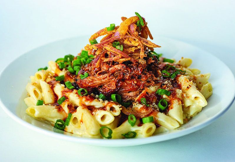 Slow Roasted NC Style Pork with House Baked Mac & Cheese Topped with Fried Pickled Red Onions, Scallions and Garlic Bread Crumbs