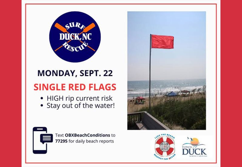 Single red flags are posted on all Duck beaches today due to dangerous ocean conditions and strong rip currents. Ocean conditions will lead to powerful rip currents and dangerous breaking waves. Ocean swimming is not recommended; stay out of the water!