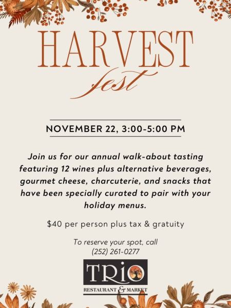 November 19 at 1:21pm via Only a few more days until Harvest Fest! Call us to reserve your spot Click here for more posts from TRiO Restaurant & MarketTRiO Restaurant & Market 3708 N. Croatan HighwayThe Bypass, MP 4.5Kitty Hawk(252) 261-0277Website DirectionsCall us