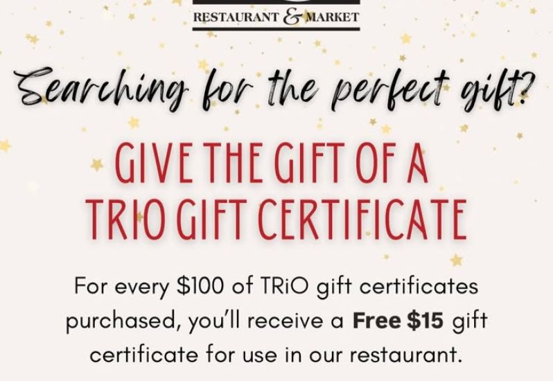 We’re running our annual holiday gift certificate special! Through Christmas Eve, for every $100 spent on gift certificates, you will receive a $15 gift certificate to spend in the restaurant!