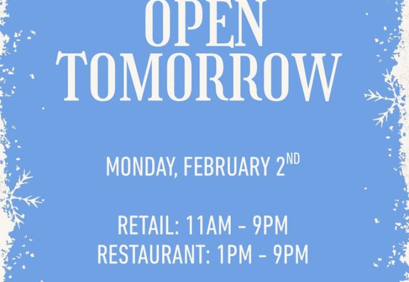 We hope you’ve enjoyed your snowy weekend! We’re back to business tomorrow with retail open from 11am-9pm and the restaurant open from 1pm-9pm.