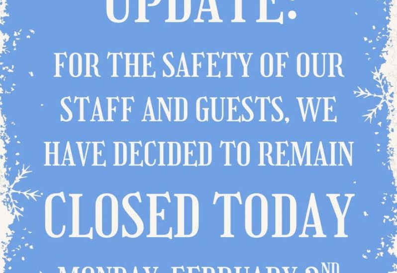 For the safety of our staff and guests, we have decided to remain closed today, February 2nd, due to the hazardous road conditions. We hope to be open tomorrow morning and will post another update later today. Stay safe!