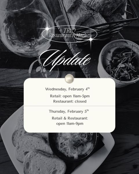 February 4 at 9:07am via We are going to be back with our regular hours of operation tomorrow. Thanks for your patience everyone! Click here for more posts from TRiO Restaurant & MarketTRiO Restaurant & Market 3708 N. Croatan HighwayThe Bypass, MP 4.5Kitty Hawk(252) 261-0277Website DirectionsCall us