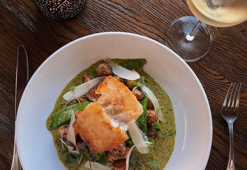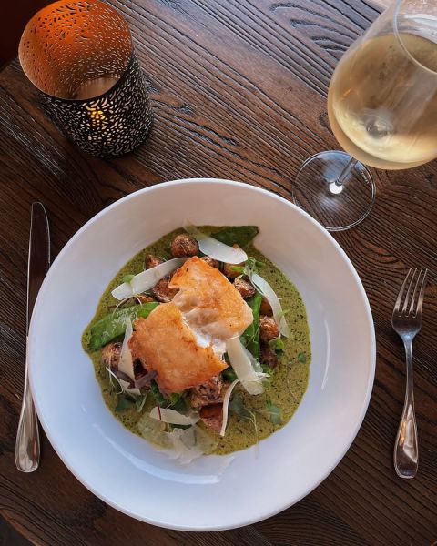 Tonight’s feature: Golden Tilefish paired with garlic roasted fingerling potatoes and snow peas over a creamy pesto sauce and finished with shaved parmesan 🍽️