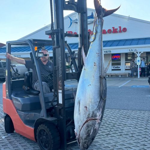 The Fish Casket Crew from Ahoskie, NC stopped by the shop that day to weigh their Bluefin after a long fight just a mile off the beach, tipping the scales at 220 lbs dressed. An unforgettable January moment. Congrats @fishcasket 🐟